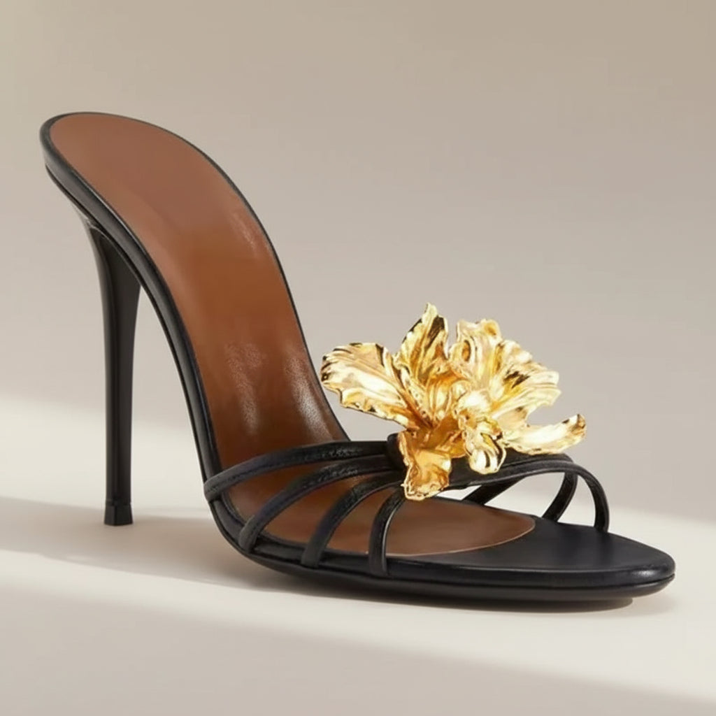 Elevate your style with our Gold Metal Detail Metallic Heels! These stunning gold and black heels will add a touch of glamour to any outfit. Featuring a delicate gold metal flower on the front, these heels are sure to turn heads and make you feel confident and stylish. Upgrade your wardrobe with these must-have heels!